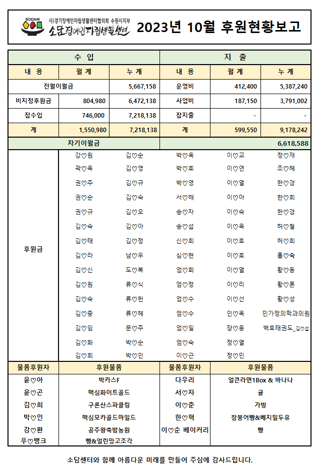 2023년 10월 후원현황보고서 페이지 정보 작성자 소담센터 댓글 0건 조회 374회 작성일 23-11-28 15:38 본문 소중한 후원 감사드립니다. (_ _) 목록 이전글2023년 11월 후원현황보고서 23.12.06 다음글2023년 9월 후원현황보고서 23.10.24 댓글목록 댓글목록 등록된 댓글이 없습니다.