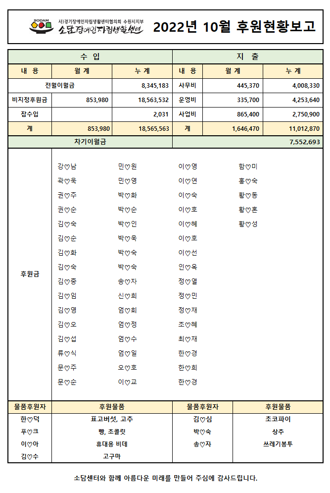 2022년 10월 후원현황보고서 페이지 정보 작성자 소담센터 댓글 0건 조회 369회 작성일 22-11-10 17:05 본문 소중한 후원 감사합니다 목록 이전글2022년 11월 후원현황보고서 22.12.19 다음글2022년 9월 후원현황보고서 22.10.25 댓글목록 댓글목록 등록된 댓글이 없습니다.