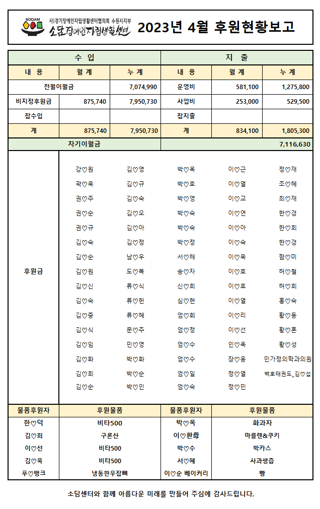 2023년 4월 후원현황보고서 페이지 정보 작성자 소담센터 댓글 0건 조회 373회 작성일 23-05-09 11:36 본문 소중한 후원 감사드립니다. (_ _) 목록 이전글2023년 5월 후원현황보고서 23.06.26 다음글2023년 3월 후원현황보고서 23.04.12 댓글목록 댓글목록 등록된 댓글이 없습니다.