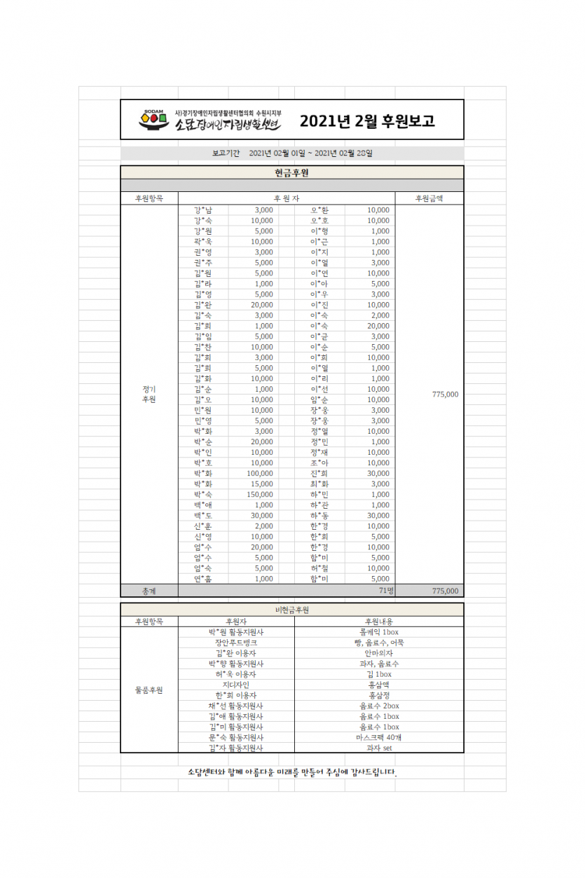 2021년 2월 후원보고서 페이지 정보 작성자 소담센터 댓글 0건 조회 776회 작성일 21-04-13 11:48 본문 소중한 후원에 감사드립니다. 목록 이전글2021년 3월 후원보고서 21.04.13 다음글2021년 1월 후원보고서 21.04.13 댓글목록 댓글목록 등록된 댓글이 없습니다.