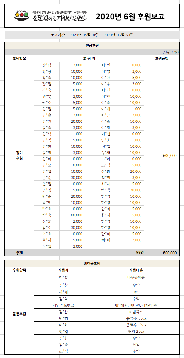 2020년 06월 후원보고서 페이지 정보 작성자 소담센터 댓글 0건 조회 699회 작성일 21-01-11 11:56 본문 후원해주신 모든 분들께 감사드립니다. 앞으로 더 열심히 활동하는 소담센터가 되겠습니다. 목록 이전글2020년 07월 후원보고서 21.01.11 다음글2020년 05월 후원보고서 21.01.11 댓글목록 댓글목록 등록된 댓글이 없습니다.