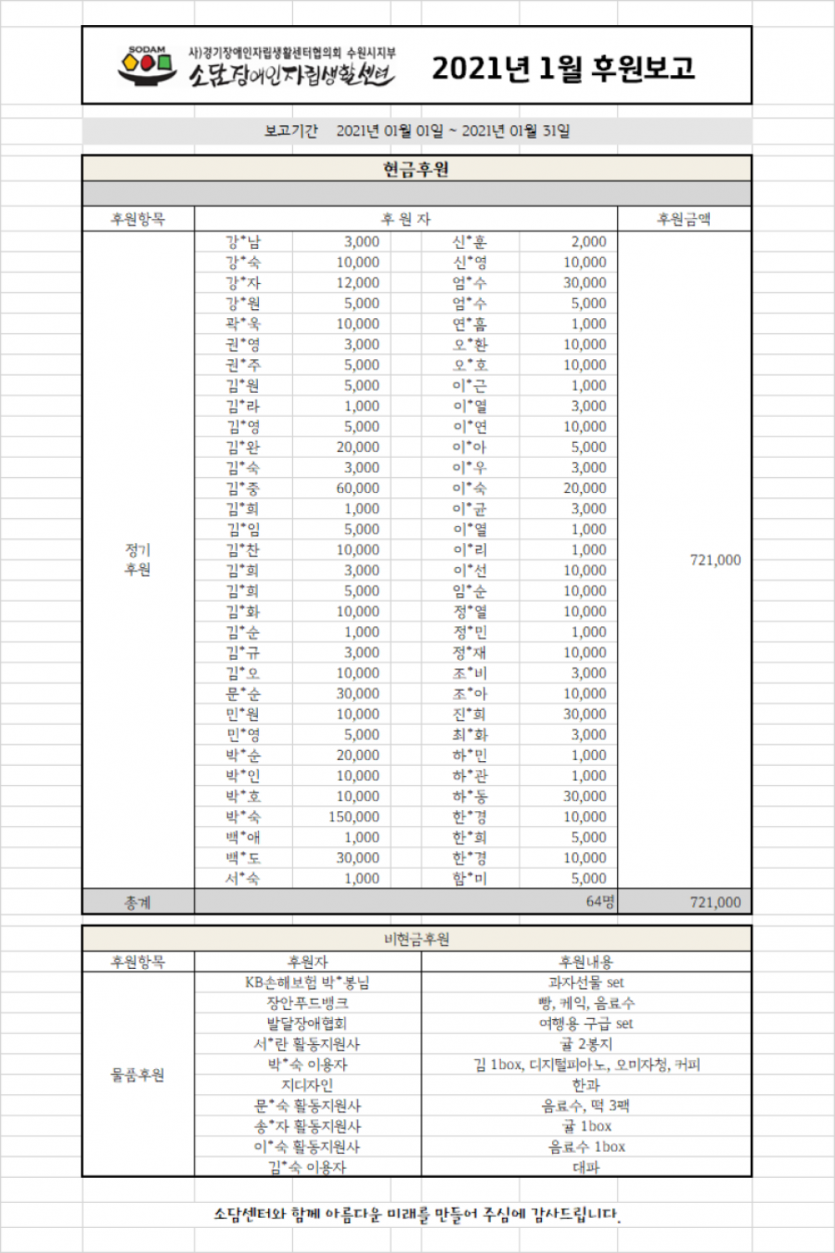2021년 1월 후원보고서 페이지 정보 작성자 소담센터 댓글 0건 조회 760회 작성일 21-04-13 11:46 본문 소중한 후원에 감사드립니다. 목록 이전글2021년 2월 후원보고서 21.04.13 다음글2020년 12월 후원보고서 21.01.11 댓글목록 댓글목록 등록된 댓글이 없습니다.