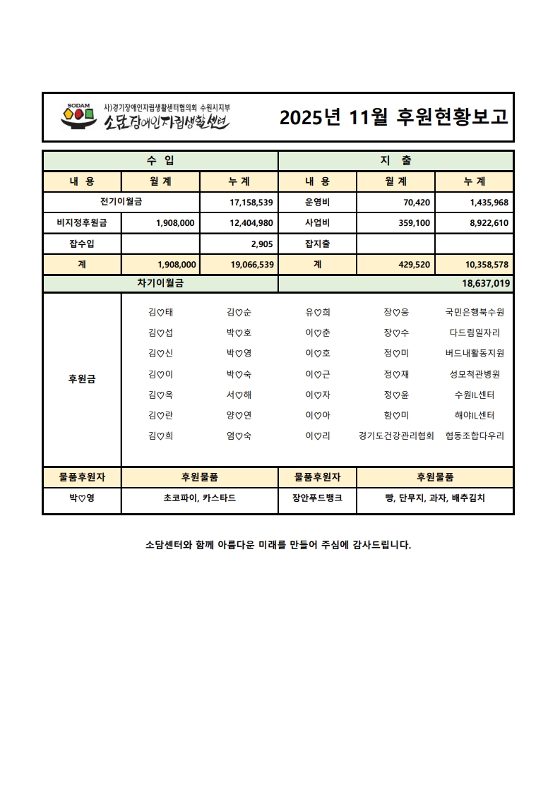 2025년 11월 후원현황보고서 페이지 정보 작성자 소담센터 댓글 0건 조회 47회 작성일 25-12-02 15:17 본문 함께 꿈을 이루어 갑니다~ 목록 이전글2025년 12월 후원현황보고서 26.01.06 다음글2025년 10월 후원현황보고서 25.11.06 댓글목록 댓글목록 등록된 댓글이 없습니다.