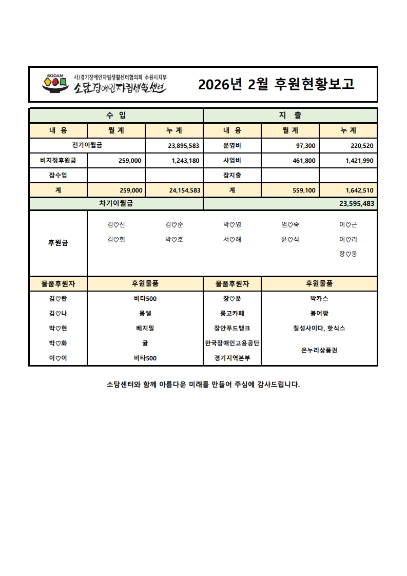 2026년 2월 후원현황보고서 페이지 정보 작성자 소담센터 댓글 0건 조회 59회 작성일 26-03-04 10:26 본문 함께 꿈을 이루어 갑니다~ 목록 이전글2026년 3월 후원현황보고서 26.04.01 다음글2026년 1월 후원현황보고서 26.02.03 댓글목록 댓글목록 등록된 댓글이 없습니다.