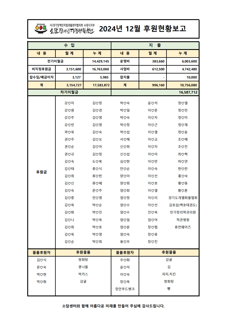 2024년 12월 후원현황보고서 페이지 정보 작성자 소담센터 댓글 0건 조회 186회 작성일 25-01-06 16:21 본문 함께 꿈을 이루어갑니다 목록 이전글2025년 1월 후원현황보고서 25.02.05 다음글2024년 11월 후원현황보고서 24.12.04 댓글목록 댓글목록 등록된 댓글이 없습니다.