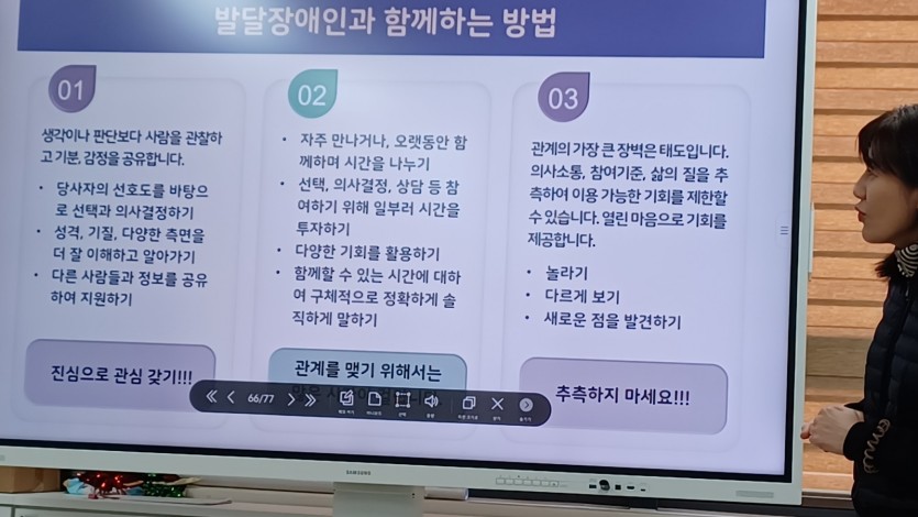 1228 발달 장애인과 관계 맺기 페이지 정보 작성자 소담센터 댓글 1건 조회 1,055회 작성일 23-12-30 19:46 본문 경기도 장애인권익옹호가관 성명진 강사님의 강의로 발달장애인과 더 잘 지내는 법, 지원하는 법 알아보았어요. 목록 이전글0123 자조모임 서로도와 1회 신년회 모임 24.02.06 다음글1228 권중 일자리 한 해동안 고생하셨습니다. 23.12.30 댓글목록 댓글목록 이승아님의 댓글 이승아 작성일 24-02-13 16:37 2023년에 이어 청룡의 기운을 받아2024년도 멋진횔약 기대합니다 답변 삭제 2023년에 이어 청룡의 기운을 받아2024년도 멋진횔약 기대합니다