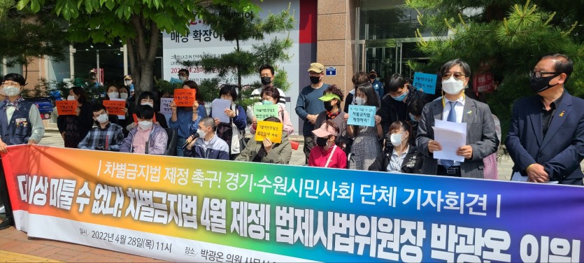 2022. 04. 28 차별금지법 제정 촉구 경기 수원시민사회 단체 기자회견 페이지 정보 작성자 소담센터 댓글 0건 조회 547회 작성일 22-04-29 11:53 본문 목록 이전글2022. 05. 02 카카오톡 이모티콘 만들기 22.05.02 다음글2022. 04. 28 장애인권동화책 22.04.29 댓글목록 댓글목록 등록된 댓글이 없습니다.