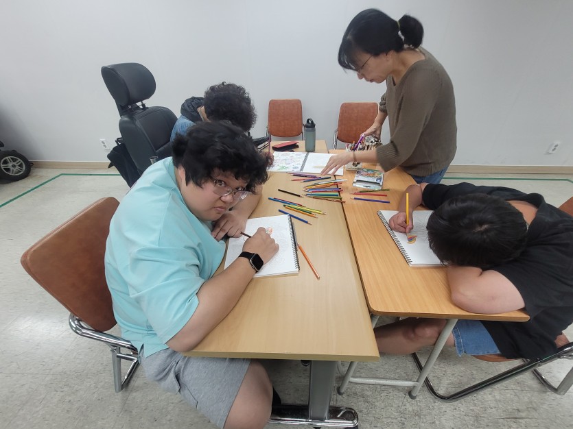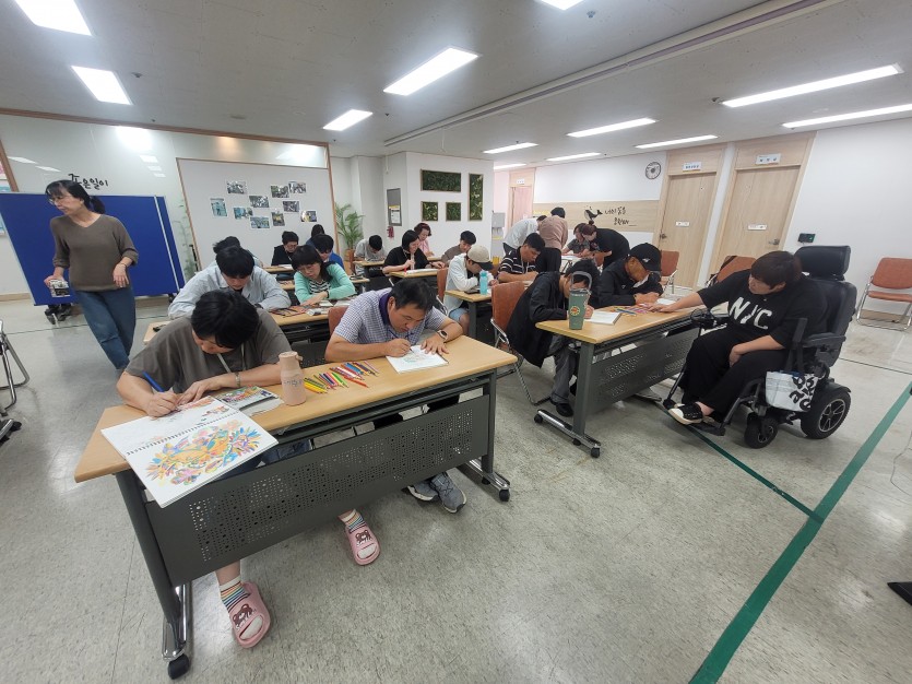 조용한 음악을 들으며 색칠하는 시간을 통해 회원들은 심리 안정을 취하고