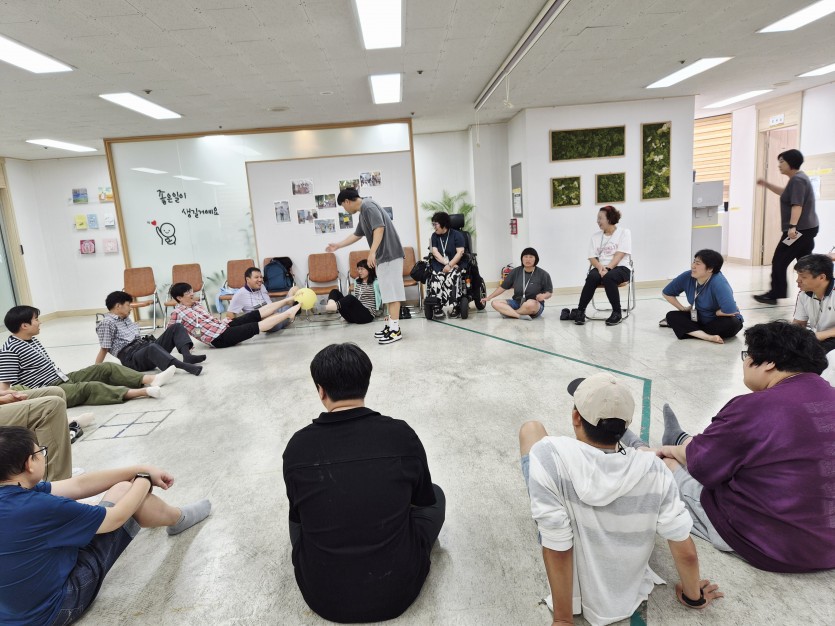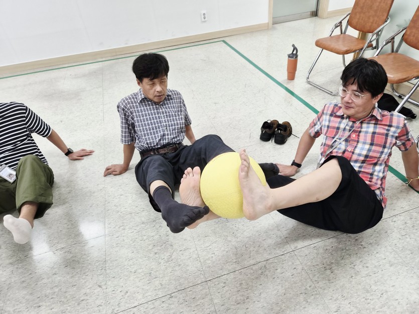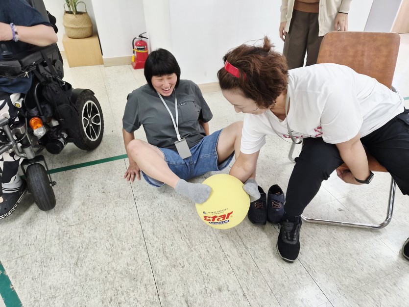 다른 운동기구는 필요없다. 공 하나로 모두의 한마음을 모아, 원형을 만들어 자리에 앉아서, 릴레이 방식으로 다리로 공을 동료에게 전달해주는 방식에 단합과 근력의 필요성이 요구 되는 시간이였음. 처음에는 다리로 공을 쥐고 있는 모습조차도 쉽지 않았지만 지역장애인 모두의 염원을 모아 하나하나 차근차근 용기와 응원을 해주니 좋은 시너지가 생기기 시작 하였음. 조금씩 공은 옆에 있는 동료에게 전달이 되기 시작했고 중간중간 놓치기도 하였지만 미리 받아주고 안전하게 공을 넘겨주려는 모습등을 통해 단결이 잘 되면서