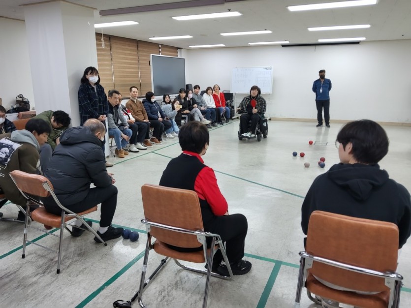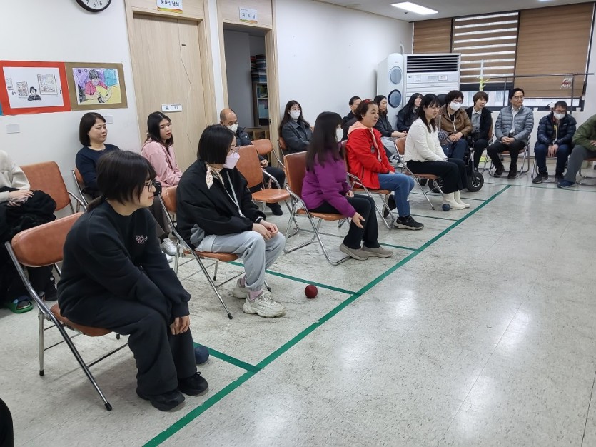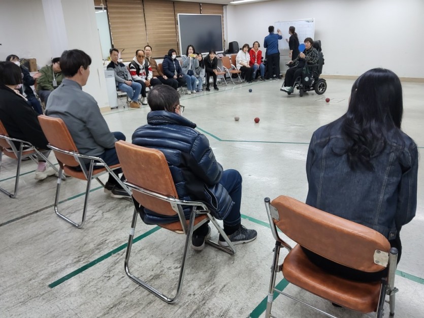 지역의 자원봉사자들과 국민은행 직원들이 우리 노동자들과 함께 장애인식 유의사항을 들어보는 시간을 가져보고 만석공원으로 플로깅을 나갈 예정이었으나 비가오는 관계로 장애인 대표 스포츠인 보치아게임을 하며 소담IL VS 국민은행 팀별 대항을 해보며 친목을 도모하는 시간을 가저보았습니다. 단순한 업무로 지역장애인을 자원봉사를 하는 것보다 보치아로 친선을 도모하며 권리중심 일자리 참여자들의 당당히 노동하는 모습을 본 국민은행 직원들의 남다른 소감을 들어볼 기회를 가져 보았고