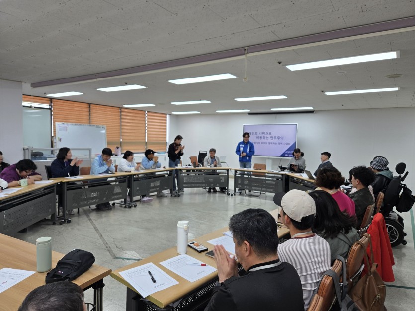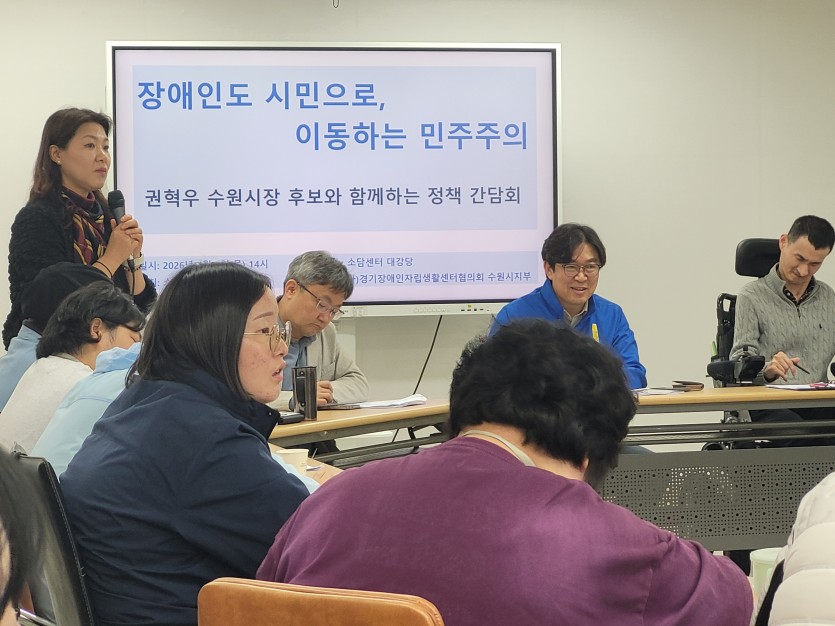 0402 정책간담회 페이지 정보 작성자 소담센터 댓글 1건 조회 7회 작성일 26-04-03 14:27 본문 지방선거 권혁우 수원시장 예비후보와 함께 장애인 권리 예산 및 정책 보장 간담회를 가졌습니다. 목록 다음글0320 독서심리 26.03.27 댓글목록 댓글목록 김기태님의 댓글 김기태 작성일 26-04-03 18:53 지방선거 권혁우 의원님 소담 센터 방문 했다. 대화 나눈고 이야기들 했다. 인사 하고 악수 하고 단체 사진 찍어다. 내이름 보여줘다. 답변 삭제 지방선거 권혁우 의원님 소담 센터 방문 했다. 대화 나눈고 이야기들 했다. 인사 하고 악수 하고 단체 사진 찍어다. 내이름 보여줘다.