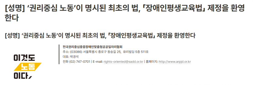 1027 [성명] ‘권리중심 노동’이 명시된 최초의 법, 「장애인평생교육법」 제정을 환영한다