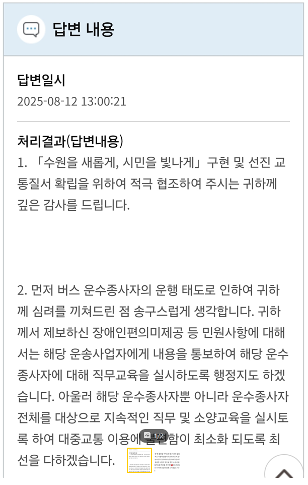 휠체어이용자가 탑승할 예정이라고 말하니 운수종사원이 성질을 내며 매우 불친절하게 경사로 설치시 주변 사람들이 놀랄 정도로 세게 내렸습니다.
