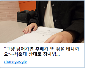 0411 “그냥 넘어가면 후배가 또 겪을 테니까요”···서울대 상대로 장차법 위반 소송 나선 언어장애 로스쿨생 페이지 정보 작성자 소담센터 댓글 0건 조회 19회 작성일 26-04-21 18:32 본문 https://www.khan.co.kr/article/202604141615001#ENT 목록 이전글0412 “시력 회복 가능성 열었다”…크리스퍼 한계 깬 유전자 기술 [출처:중앙일보] 26.04.21 다음글0410 전국 최초 발달 장애 가정 한글 지침서 발간 26.04.21 댓글목록 댓글목록 등록된 댓글이 없습니다.