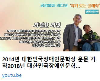 0209 대한민국 장애인문학상 서성윤 시인 라디오 방송 페이지 정보 작성자 소담센터 댓글 0건 조회 34회 작성일 26-02-09 23:33 본문 권중 활동가 이승아님의 추천으로 글을 올리게 되었습니다. 우리들의 이야기네요. https://youtu.be/a0VW1kGhPi0?si=3ycuOu5UCeTJe92h 목록 다음글0209 장애인의 평생학습과 완전한 사회참여 실현」 국제학술대회 .종합정리 26.02.09 댓글목록 댓글목록 등록된 댓글이 없습니다.