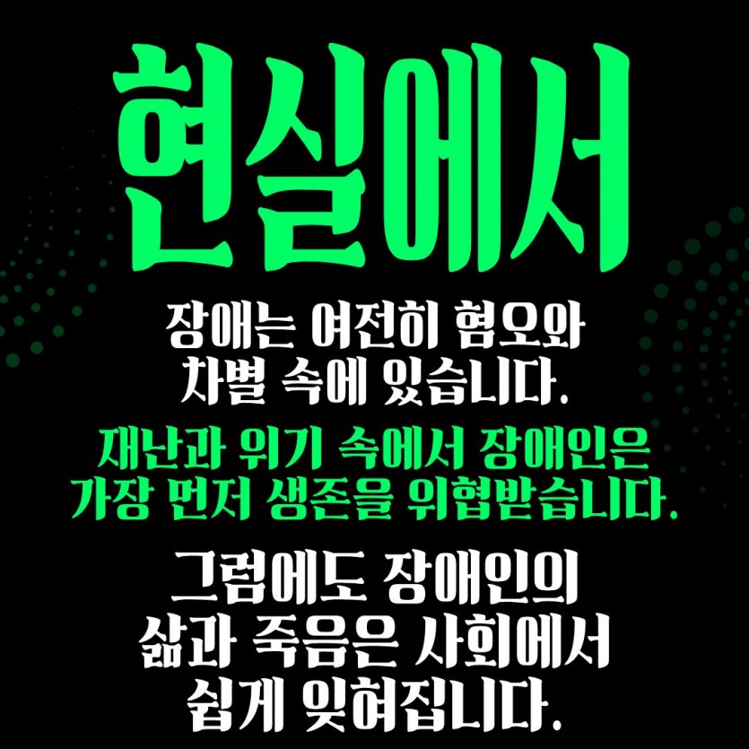 재난과 위기 속에서 장애인은 가장 먼저 생존을 위협 받습니다.