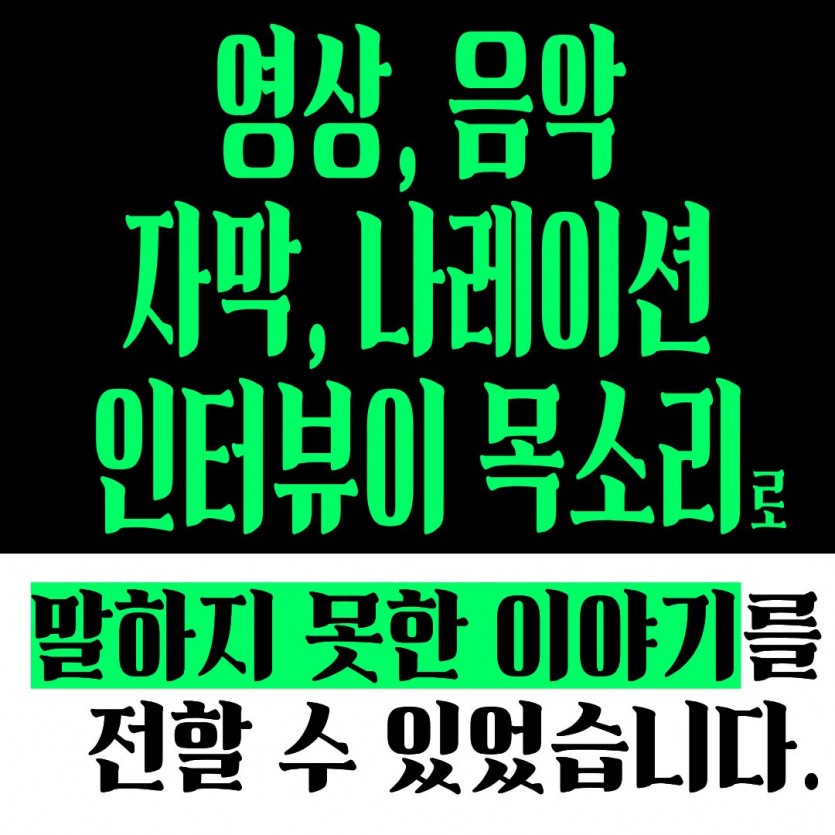 영상, 음악, 자막, 나레이션, 인터뷰이의 목소리로