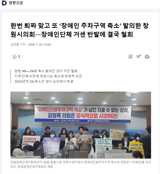 0120 한번 퇴짜 맞고 또 ‘장애인 주차구역 축소’ 발의한 창원시의회···장애인단체 거센 반발에 결국 철회 경향신문