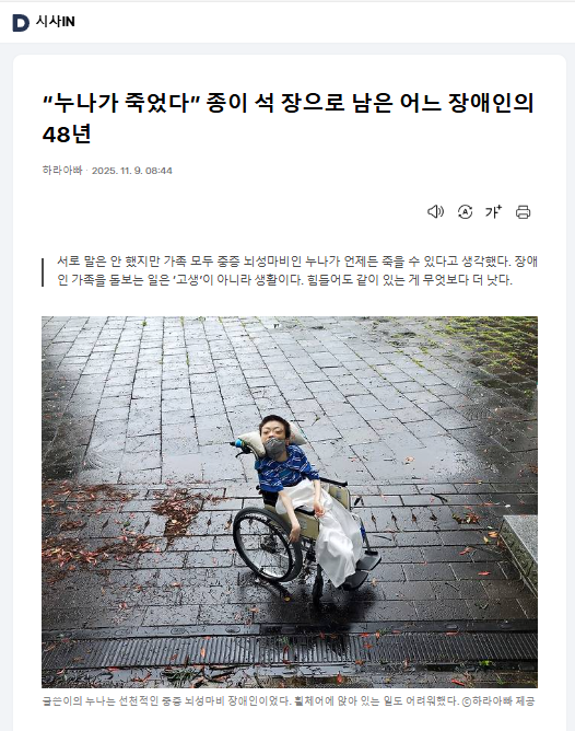 서로 말은 안 했지만 가족 모두 중증 뇌성마비인 누나가 언제든 죽을 수 있다고 생각했다.