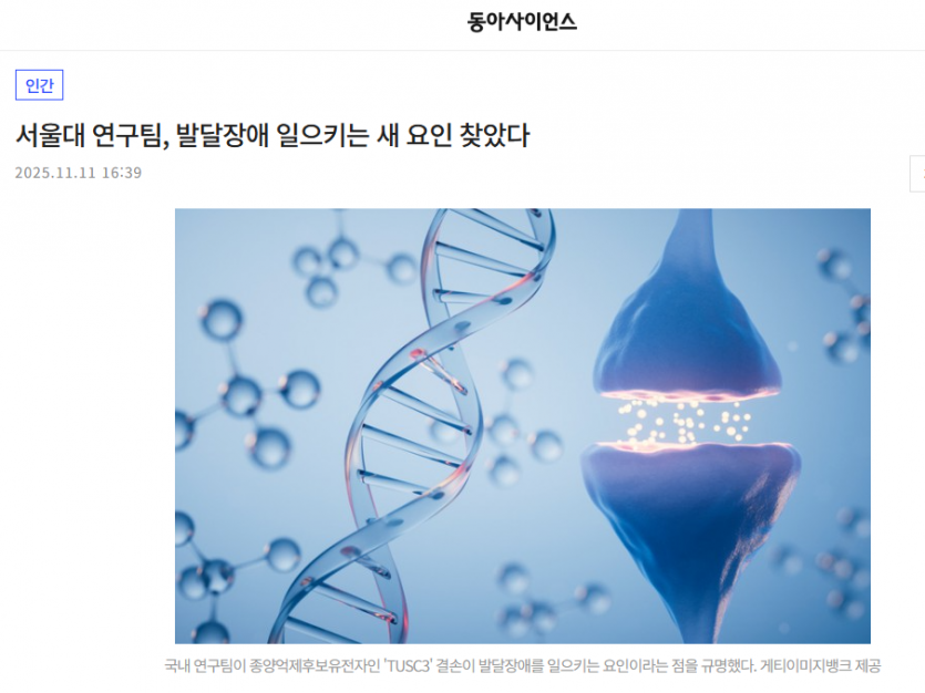 서울대는 정용근 자연과학대 명예교수, 박경린 박사과정생이 TUSC3-결손 발달장애(지적장애)의 원인을 규명하고 치료 단서를 제시한 연구결과를 7일(현지시간) 국제학술지 '네이처 커뮤니케이션즈'에 발표했다고 11일 밝혔다.
