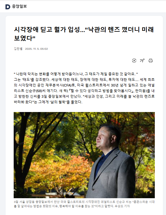 그는 ‘태도’를 강조했다. 세상에 대한 태도, 장애에 대한 태도, 투자에 대한 태도…. 세계 최초의 시각장애인 공인 재무분석사(CFA)로, 미국 월스트리트에서 30년 넘게 일하고 있는 애널리스트 신순규(58)씨 얘기다. 새 책( 『할 수 있다 생각하고 방법을 찾아봅시다』, 판미동)을 내고 방한한 신씨를 3일 중앙일보에서 만났다. “세상과 인생, 그리고 미래를 늘 낙관의 렌즈로 바라봐 왔다”는 그에게 ‘삶의 철학’을 물었다.