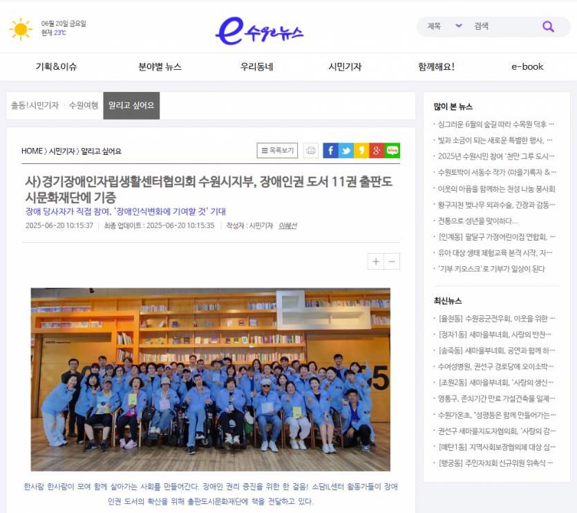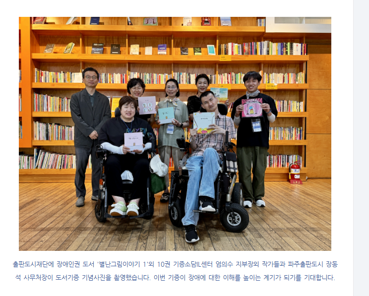 지난 6월 12일, 사)경기장애인자립생활센터협의회 수원시지부(이하 소담IL센터)는 장애 당사자들이 직접 제작에 참여한 장애인권 도서 11권을 경기도 파주의 출판도시문화재단에 기증했다.