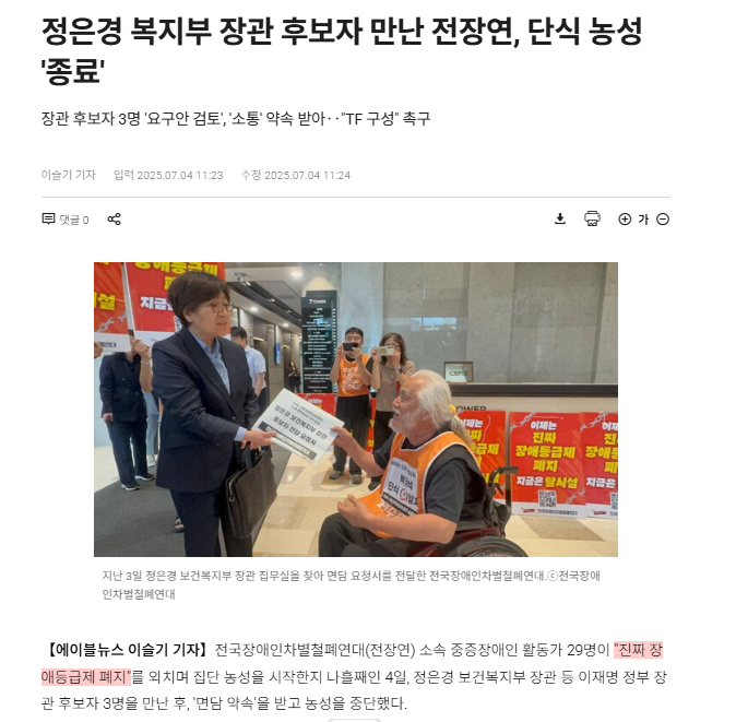 0702 정은경 복지부 장관 후보자 만남 전장연, 단식농성 "종료" 페이지 정보 작성자 소담센터 댓글 1건 조회 177회 작성일 25-07-04 17:43 본문 https://www.ablenews.co.kr/news/articleView.html?idxno=222968 목록 이전글0710 삶이 바뀌었어요… 경기도, '장애인 기회소득 굿파트너' 출범 25.07.10 다음글0620 사)경기장애인자립생활센터협의회 수원시지부, 장애인권 도서 11권 출판도시문화재단에 기증 장애 당사자가 직접 참여, '장애인식변화에 기여할 것' 기대 25.06.20 댓글목록 댓글목록 김기태님의 댓글 김기태 작성일 25-07-06 06:51 투쟁... 답변 삭제 투쟁...
