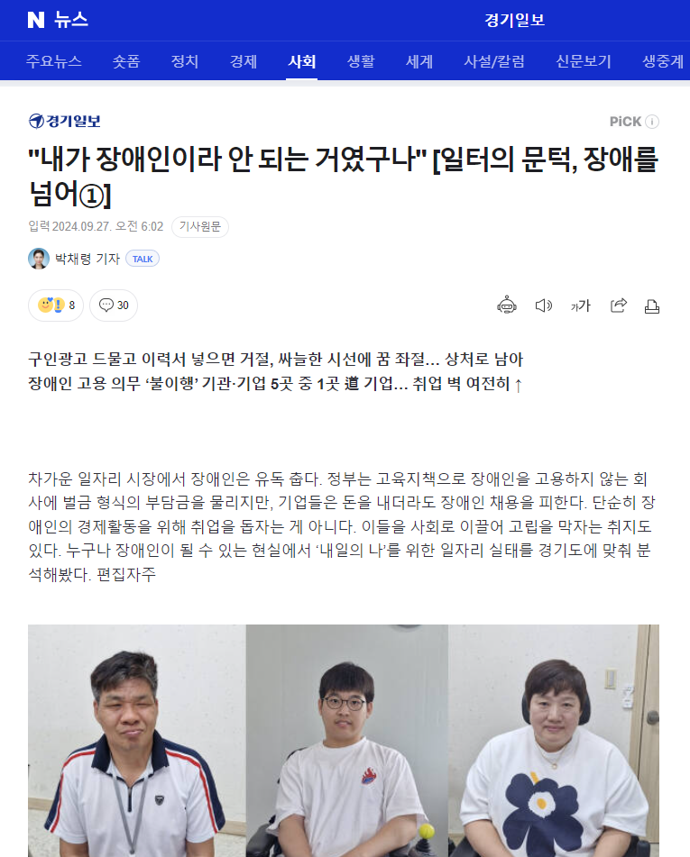 0927 경기일보 " 내가 장애인이라 안되는거였구나 "[ 일터의 문턱 장애을 넘어 1 ] 페이지 정보 작성자 소담센터 댓글 0건 조회 313회 작성일 24-09-27 09:22 본문 https://n.news.naver.com/article/666/0000053066 목록 이전글0927 UN장애인권리협약 국내 이행 가시화, 협약의 국내법 적용 위한 5개 법률 개정안 발표! 24.09.27 다음글0920 경기도, 3년 간 934억 투입 발달장애인 지원 44개 사업 추진 ‘2024~2026 경기도 발달장애인 지원 기본계획’ 수립 발표 24.09.19 댓글목록 댓글목록 등록된 댓글이 없습니다.