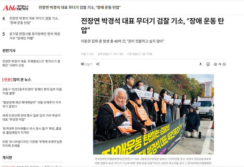 이어 김 변호사는 “장애인의 이동권을 위한 평화적 집회는 민주사회에서 수용되어야 할 정당한 권리”라면서 “변호인단은 기소에 맞서 박경석 대표와 끝까지 함께 싸워 장애인의 권리가 보장되는 사회를 실현하고자 한다”고 강조했다.