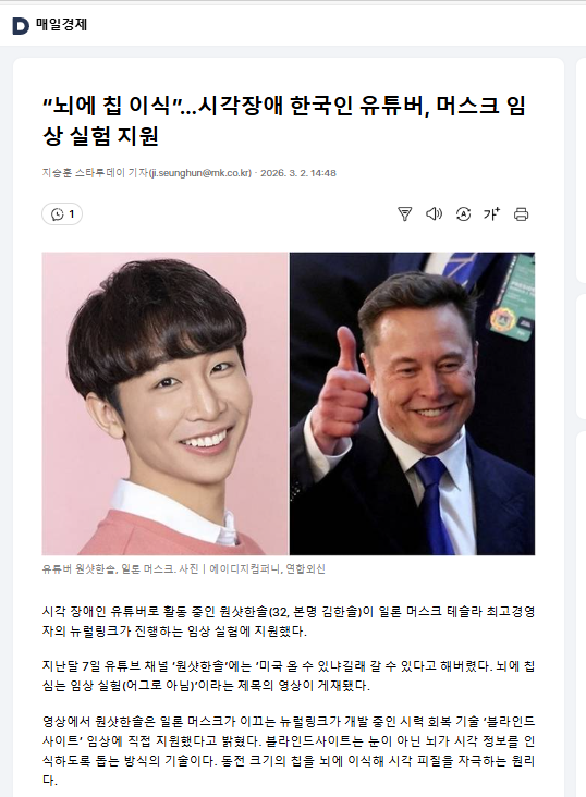 0301 “뇌에 칩 이식”…시각장애 한국인 유튜버, 머스크 임상 실험 지원 페이지 정보 작성자 소담센터 댓글 1건 조회 48회 작성일 26-03-03 09:40 본문 https://v.daum.net/v/20260302144800628 목록 이전글0302 [단독]장애인고용 ‘모범기업’, 알고보니 직고용 2년 뒤 계약 해지 26.03.03 다음글0227 움직일 수 있는 건 두 눈뿐… 안구 마우스로 반년 만에 완성한 웹툰 26.03.03 댓글목록 댓글목록 정석민님의 댓글 정석민 작성일 26-03-03 16:39 소담센터 파이팅!!! 답변 삭제 소담센터 파이팅!!!