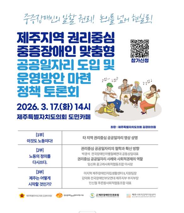 토론은 김경미 제주특별자치도의회 행정자치위원회 의원이 좌장을 맡아 진행하며, 토론자로 △이지혁 제주장애인자립생활센터 IL지원팀장 △김덕화 전국장애인부모연대제주지부 부지부장 △ 민신철 푸른팜사회적협동조합 대표가 참여한다.