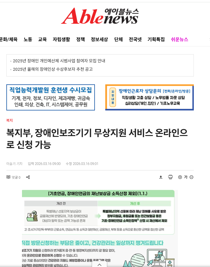 0316 복지부, 장애인보조기기 무상지원 서비스 온라인으로 신청 가능- 에이블 뉴스 페이지 정보 작성자 소담센터 댓글 0건 조회 11회 작성일 26-03-16 15:50 본문 https://www.ablenews.co.kr/news/articleView.html?idxno=229563 목록 다음글0316 부산시, 장애인시티투어 '나래버스' 정기운행 시작‥대표 관광지 순환 - 에이블 뉴스 26.03.16 댓글목록 댓글목록 등록된 댓글이 없습니다.