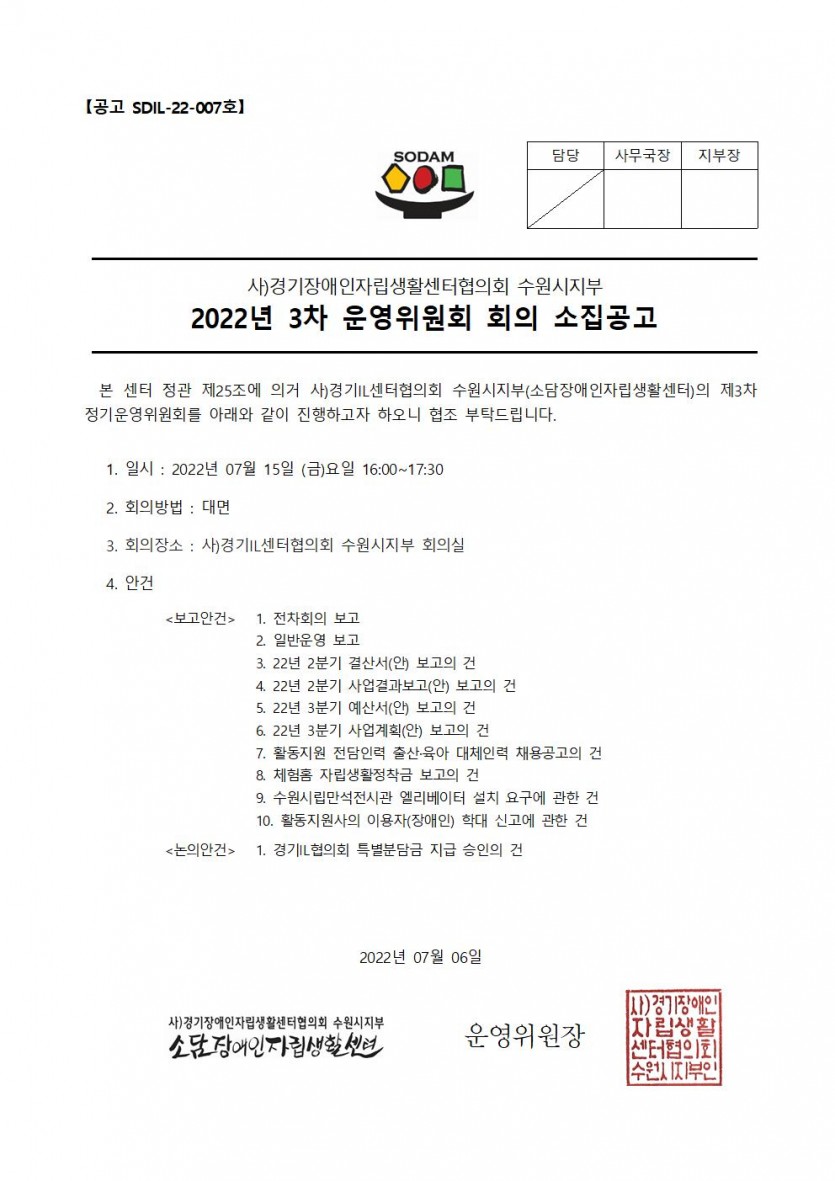2022년 3차 운영위원회 회의 소집공고 페이지 정보 작성자 소담센터 댓글 0건 조회 1,117회 작성일 22-07-12 09:33 본문 . 목록 이전글소담센터 활동지원팀 출산휴가 대체인력 채용 최종합격자 공지 22.07.18 다음글[현장 24시] 계단에 막힌 장애인 "승강기 없어 전시 관람 포기" 22.07.04 댓글목록 댓글목록 등록된 댓글이 없습니다.