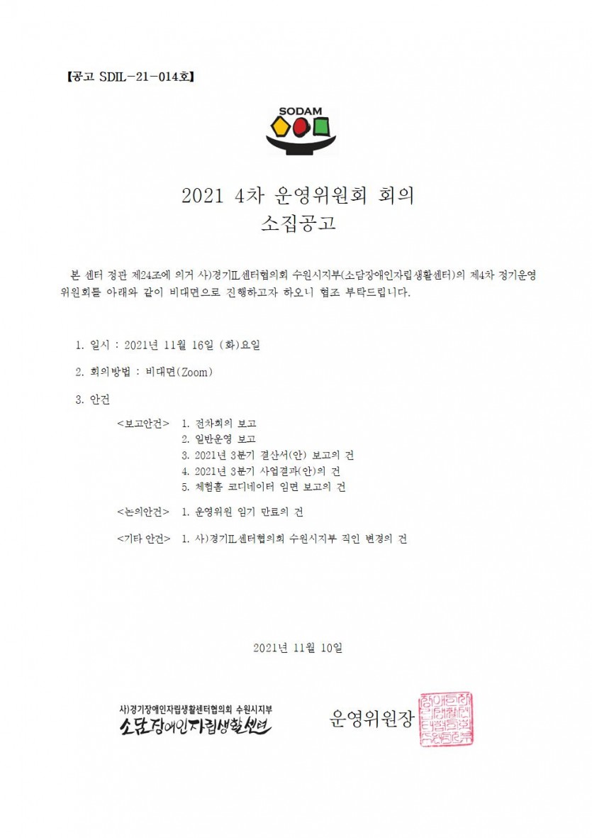 2021 4차 운영위원회 회의 소집공고 페이지 정보 작성자 소담센터 댓글 0건 조회 1,208회 작성일 21-11-10 15:44 본문 . 목록 이전글2021 1차 활동지원사업 임시운영위원회 회의 소집공고 21.11.15 다음글소담센터 체험홈 코디네이터 최종 합격자 공지 21.10.20 댓글목록 댓글목록 등록된 댓글이 없습니다.
