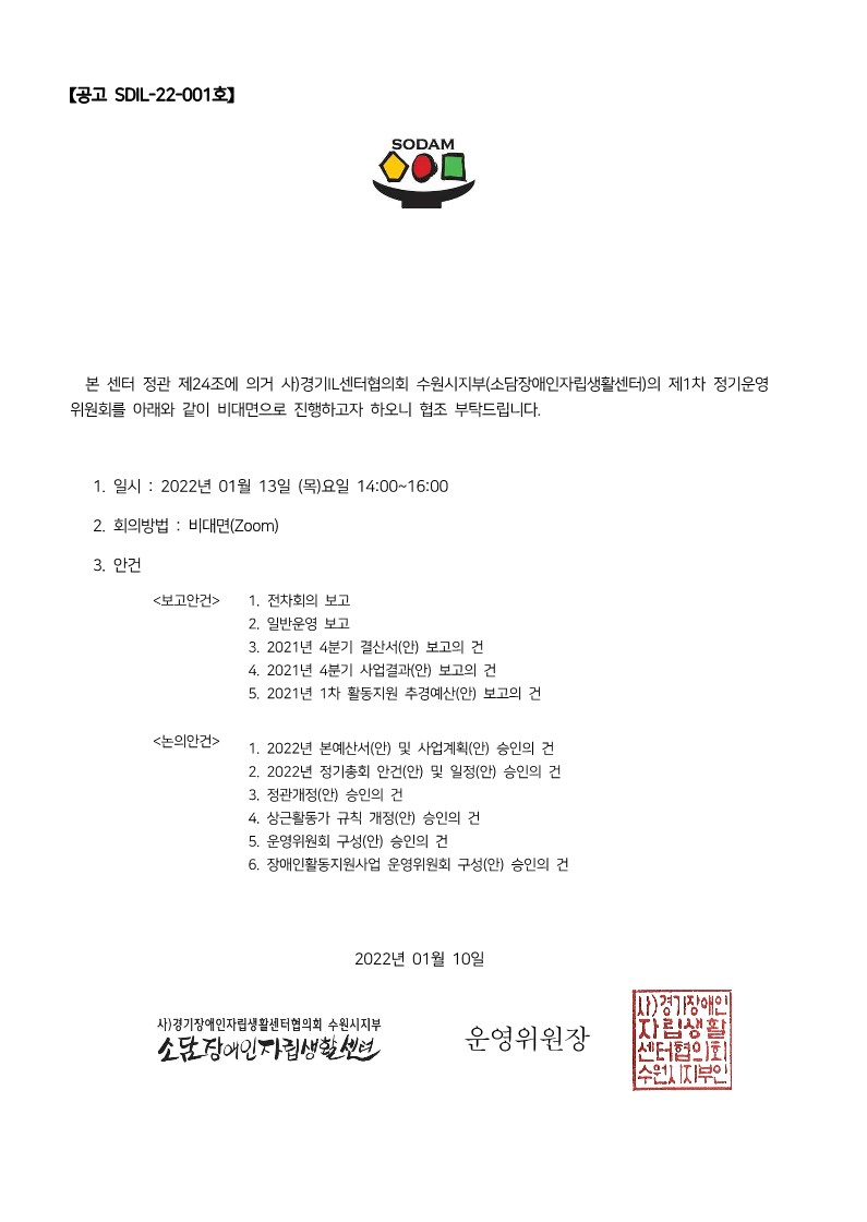 2022. 1분기 운영위원회 공고 페이지 정보 작성자 소담센터 댓글 0건 조회 1,214회 작성일 22-01-10 13:38 본문 . 목록 이전글소담에서 센터 홍보하기~~^^ 22.01.19 다음글콩나물 키우기 이벤트 참여영상 (슬기로운 집콕생활 ) 당첨자 명단 21.12.30 댓글목록 댓글목록 등록된 댓글이 없습니다.