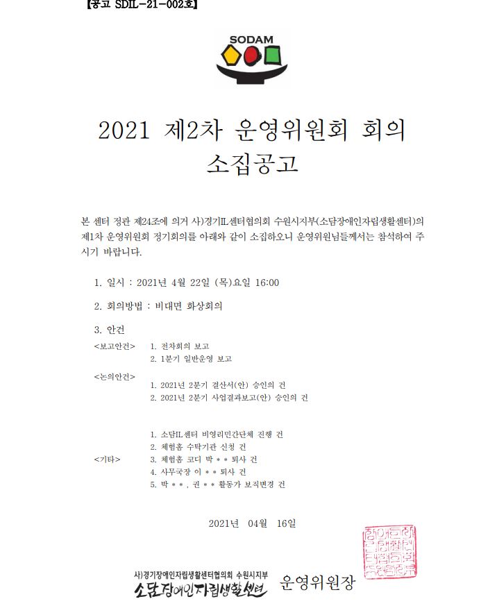 2021 제2차 운영위원회 회의 소집공고 페이지 정보 작성자 소담센터 댓글 0건 조회 1,331회 작성일 21-04-16 13:30 본문 . 목록 이전글[자립생활지원팀 팀장 채용] 21.05.12 다음글[체험홈 코디네이터 채용] 최종합격자 공지 21.03.26 댓글목록 댓글목록 등록된 댓글이 없습니다.