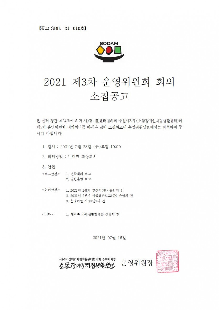 2021 제3차 운영위원회 회의 소집공고 페이지 정보 작성자 소담센터 댓글 0건 조회 1,297회 작성일 21-07-16 17:36 본문 . 목록 이전글활동지원사업 전담인력 2차 채용 최종합격자 공지 21.07.22 다음글활동지원사업 전담인력 2차 채용공고문 21.07.12 댓글목록 댓글목록 등록된 댓글이 없습니다.