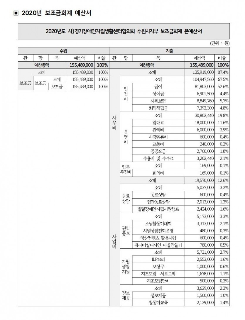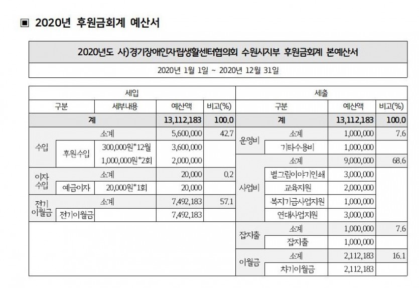 2020년 예산서 페이지 정보 작성자 소담센터 댓글 0건 조회 2,137회 작성일 20-03-12 15:15 본문 2020년 총회를 통해 승인된 각 예산별 예산서 공유합니다. 열심히 활동하는 소담센터가 되겠습니다. 목록 이전글장애인식개선 동화책 e-book 발간 20.03.12 다음글2019년 일반회계 결산서 20.03.12 댓글목록 댓글목록 등록된 댓글이 없습니다.