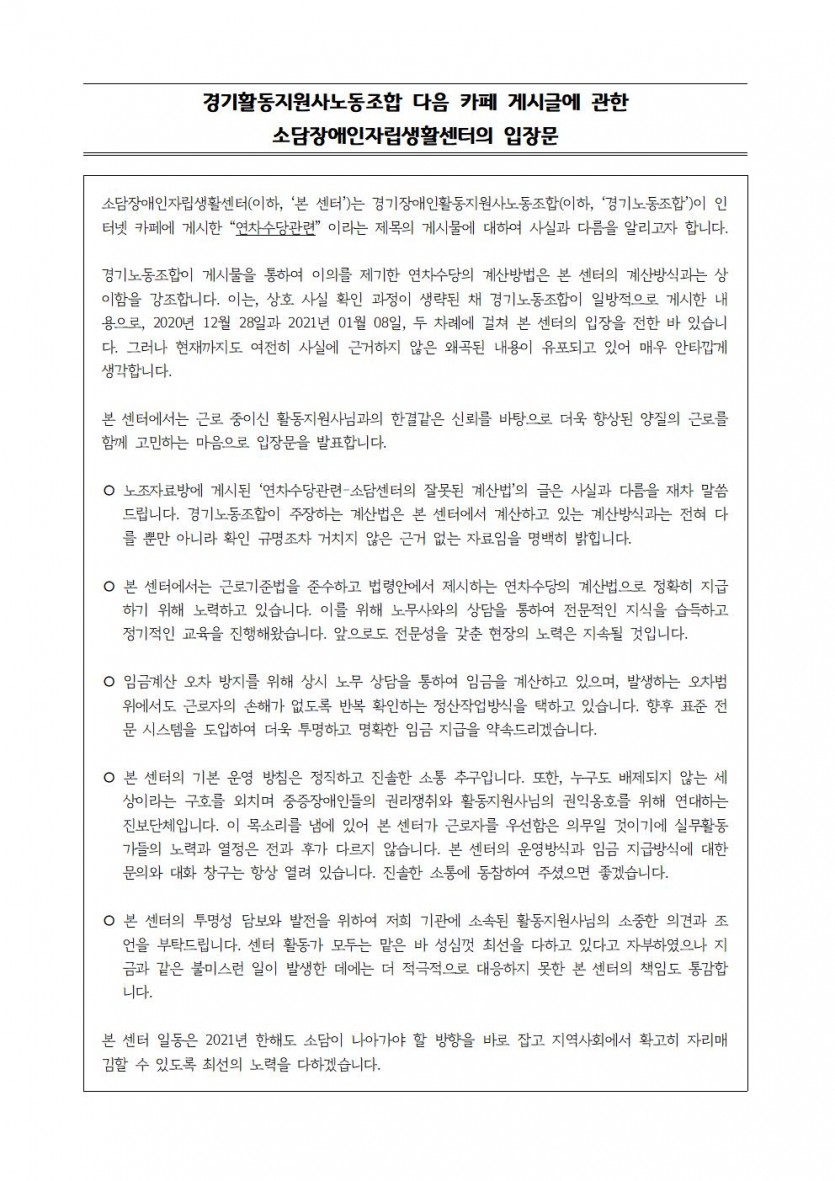 경기활동지원사노동조합 다음카페 게시글에 관한 소담센터의 입장문