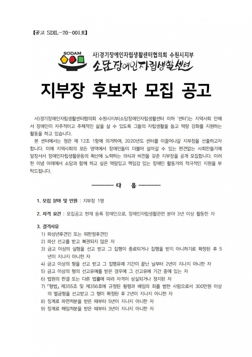 공고문과 같이 2020년부터 사)경기IL센터협의회 수원시지부를 이끌어갈 지부장을 선출하고자 합니다.