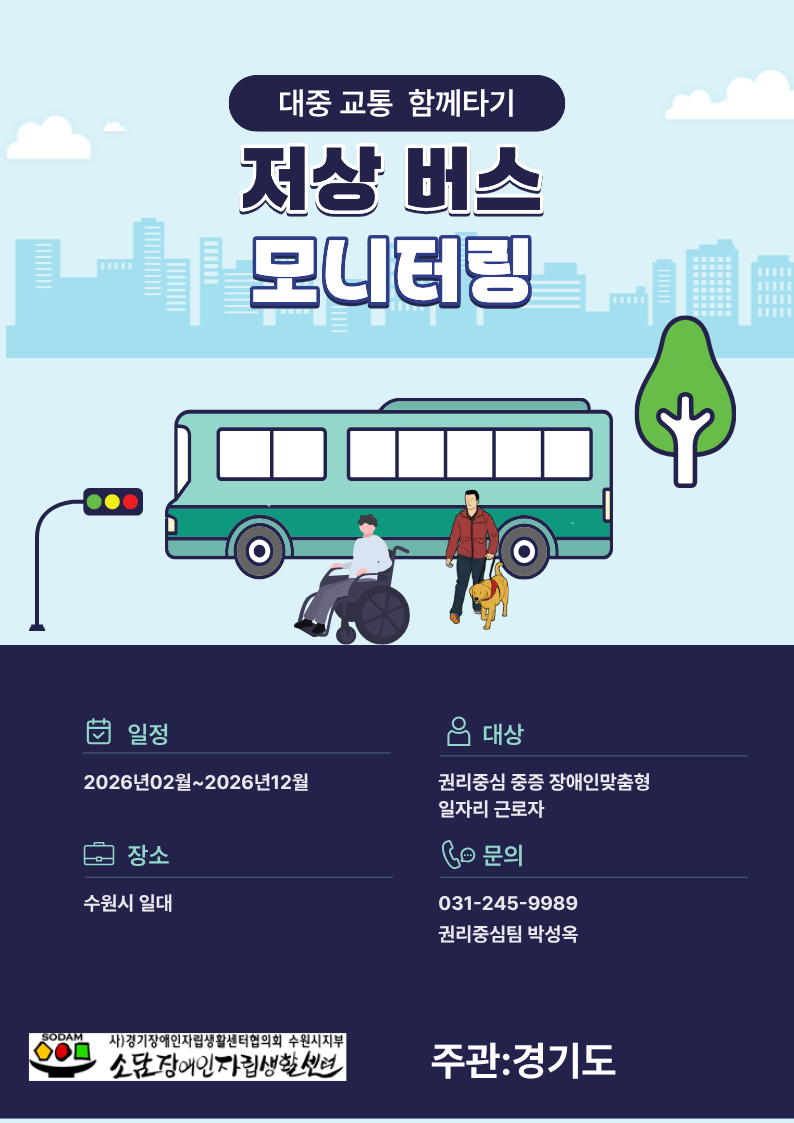 0120 장애인이동권 저상버스 모니터링 참여자를 모집합니다. 페이지 정보 작성자 소담센터 댓글 0건 조회 52회 작성일 26-01-28 00:16 본문 장애인이동권 모니터링을 함께 할 지역장애인들의 많은 참여바랍니다. 목록 이전글0120 장애인주치의 병원 모니터링 참여자를 모집합니다. 26.01.28 다음글0120 권리 풍물 참여자를 모집합니다. 26.01.28 댓글목록 댓글목록 등록된 댓글이 없습니다.