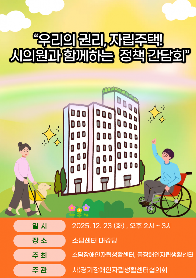 자립주택 정책 간담회 개최 페이지 정보 작성자 소담센터 댓글 0건 조회 76회 작성일 25-12-23 09:07 본문 우리의 권리, 자립주택! 시의원과 함께하는 정책 간담회를 개최 합니다. 많은 관심과 참여 부탁드립니다. 목록 이전글2026년 활동지원사업 예산서 공고의 건 25.12.23 다음글2025년 자립생활지원사업 제1차 임시 운영위원회 소집 공고 25.12.16 댓글목록 댓글목록 등록된 댓글이 없습니다.