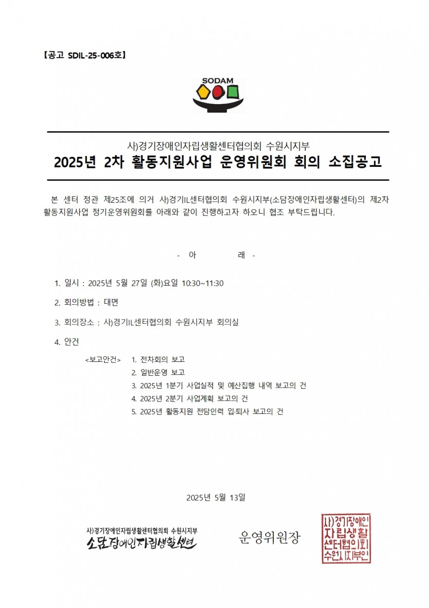 25년 활동지원사업 제2차 정기운영위원회 공고의 건 페이지 정보 작성자 소담센터 댓글 0건 조회 511회 작성일 25-05-19 08:57 본문 . 목록 이전글0527 2025년 권리중심 중증장애인 맞춤형일자리 활동가 워크샵 ! 25.05.27 다음글2025년 소담센터 활동가 대회 참여 인원을 모집합니다. 25.05.16 댓글목록 댓글목록 등록된 댓글이 없습니다.