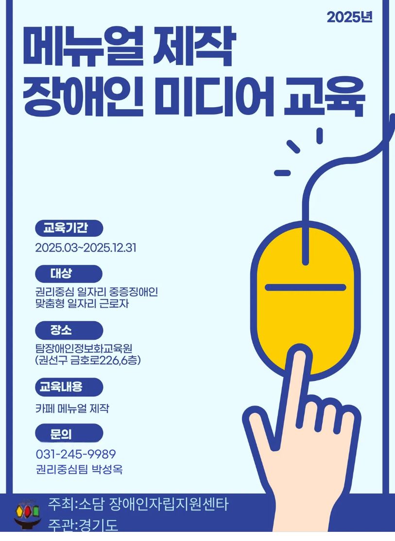 0220 미디어교육 참여자 모집 페이지 정보 작성자 소담센터 댓글 0건 조회 58회 작성일 25-02-20 22:10 본문 수원시 탑 장애인정보화교육원에서 이루어지는 미디어교육에 관심있는 지역장애인의 많은 참여바랍니다. 목록 이전글0220 지역장애인 권리댄스 사업 참여자 모집 25.02.20 다음글0220 장애인식개선교육 참여자 모집 25.02.20 댓글목록 댓글목록 등록된 댓글이 없습니다.