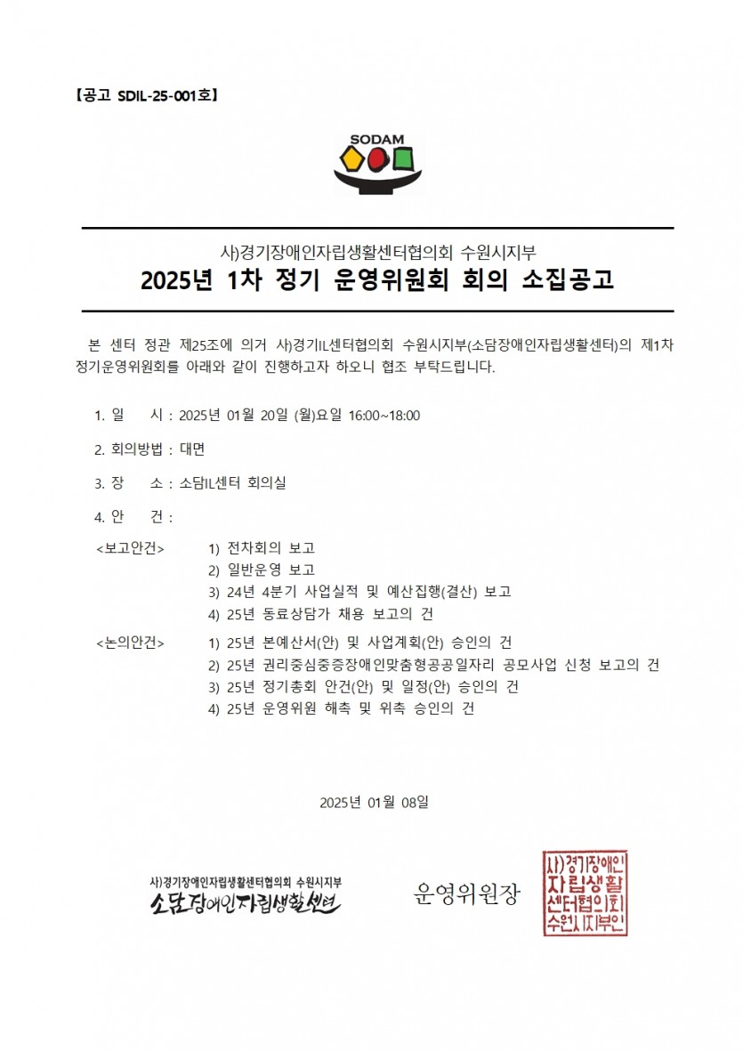 2025년 제1차 정기운영위원회 개최 공고의 건 페이지 정보 작성자 소담센터 댓글 0건 조회 832회 작성일 25-01-17 16:18 본문 . 목록 이전글2025년 활동지원사업 1분기 정기운영위원회 회의 소집공고 25.01.17 다음글2024년 동료상담가 최종 합격자 공고 24.12.30 댓글목록 댓글목록 등록된 댓글이 없습니다.