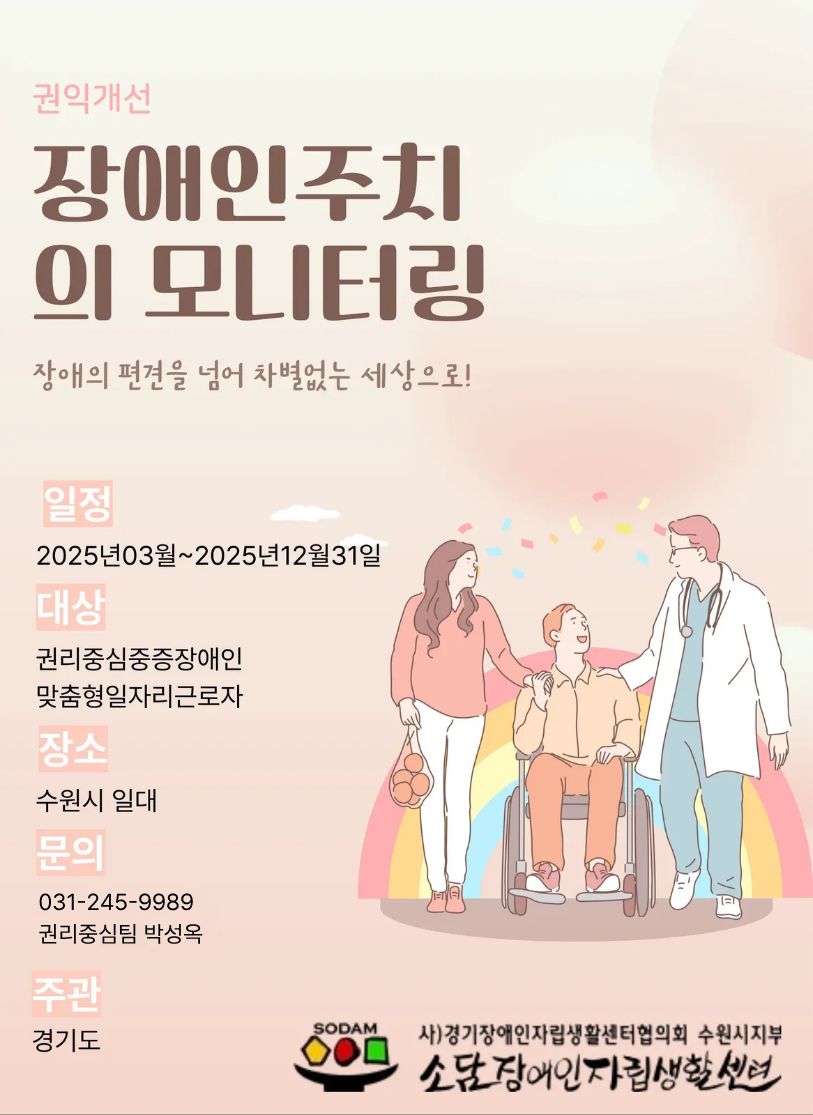 0220 장애인주치의 모니터링 사업 참여자 모집 페이지 정보 작성자 소담센터 댓글 0건 조회 59회 작성일 25-02-20 22:05 본문 지역 장애인들의 많은 참여 바랍니다. 목록 이전글0220 지역사회 캠페인 참여자 모집 25.02.20 다음글0220 권리 를 알리는 국악 풍물 참여자 모집 25.02.20 댓글목록 댓글목록 등록된 댓글이 없습니다.