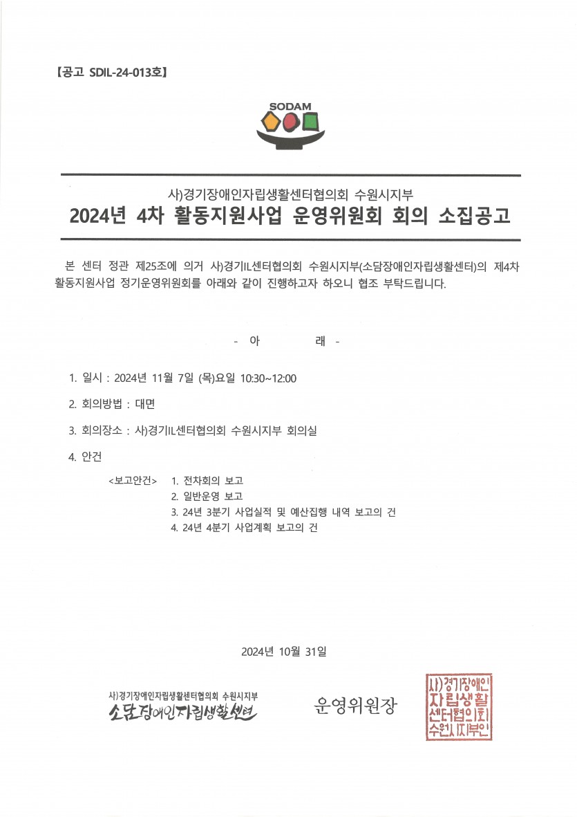 2024년 활동지원사업 4분기 정기운영위원회 회의 소집공고 페이지 정보 작성자 소담센터 댓글 0건 조회 898회 작성일 24-10-31 18:04 본문 2024년 활동지원사업 4분기 정기운영위원회 회의 소집공고 목록 이전글11월 22일 금요일 오후 2시~4시 소담소담한 장애인권 북 콘서트를 개최합니다. 24.11.04 다음글1004 장애인주치의 매산힐스치과 MOU 체결 24.10.04 댓글목록 댓글목록 등록된 댓글이 없습니다.