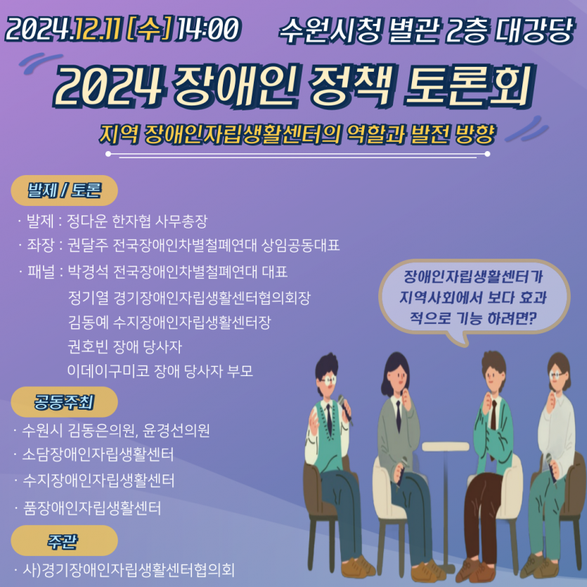 *시국이 혼란스러운 지금, 지역 IL센터의 역할과 방향성에 대한 토론회를 진행하게 되었습니다. 바쁘시더라도 수원에서 처음 진행하는 정책 토론회인 만큼 많은 참석을 부탁드립니다.