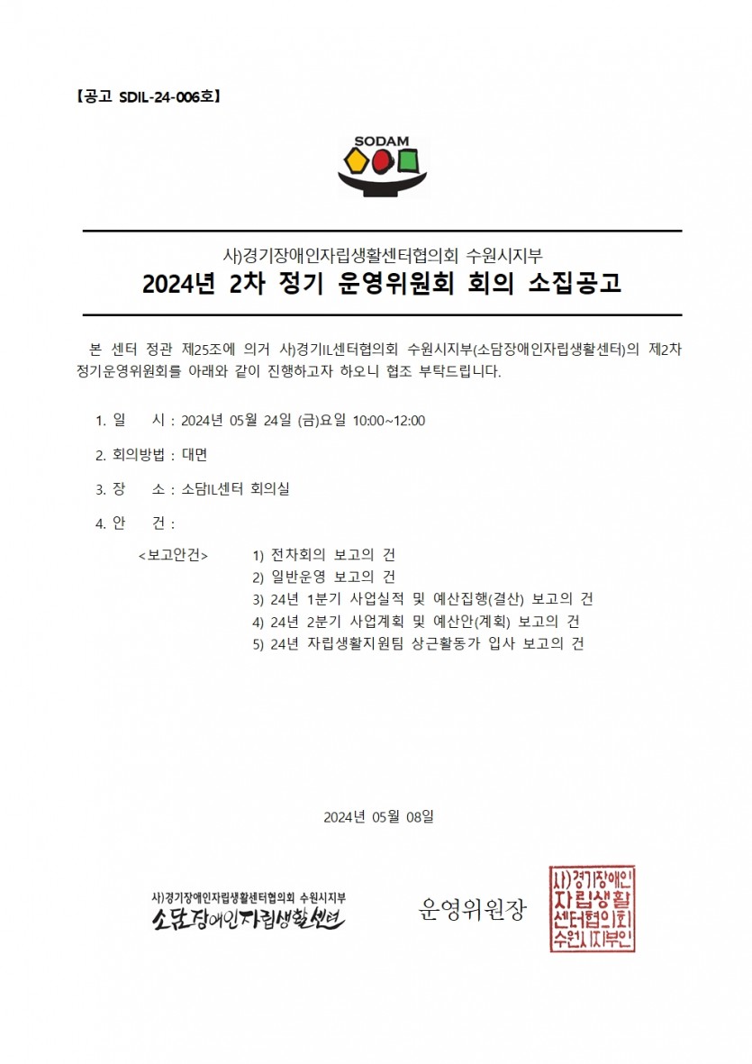 2024년 2분기 자립생활지원사업 정기운영위원회 회의 소집공고 페이지 정보 작성자 소담센터 댓글 0건 조회 983회 작성일 24-05-20 09:53 본문 2024년 2분기 자립생활지원사업 정기운영위회 회의 소집 공고 목록 이전글2024년 활동지원사업 2분기 정기운영위원회 회의 소집공고 24.05.20 다음글2024 '자립생활교육' 참여자 모집 24.03.19 댓글목록 댓글목록 등록된 댓글이 없습니다.