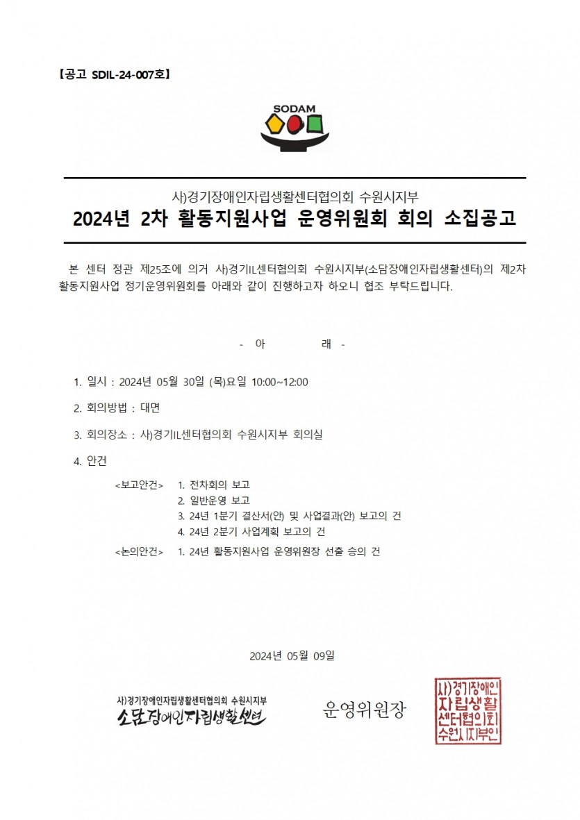 2024년 활동지원사업 2분기 정기운영위원회 회의 소집공고 페이지 정보 작성자 소담센터 댓글 0건 조회 1,021회 작성일 24-05-20 09:54 본문 2024년 활동지원사업 2분기 정기운영위원회 회의 소집공고 목록 이전글2024년 '성인권교육' 참여자 모집 24.05.28 다음글2024년 2분기 자립생활지원사업 정기운영위원회 회의 소집공고 24.05.20 댓글목록 댓글목록 등록된 댓글이 없습니다.